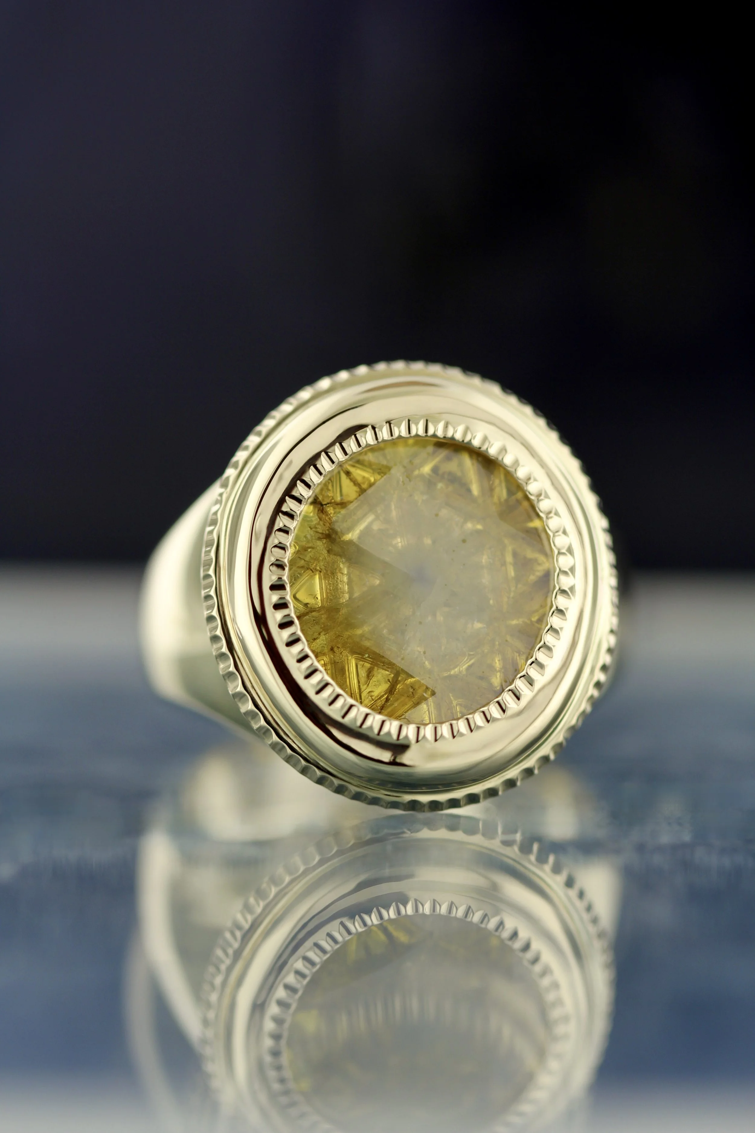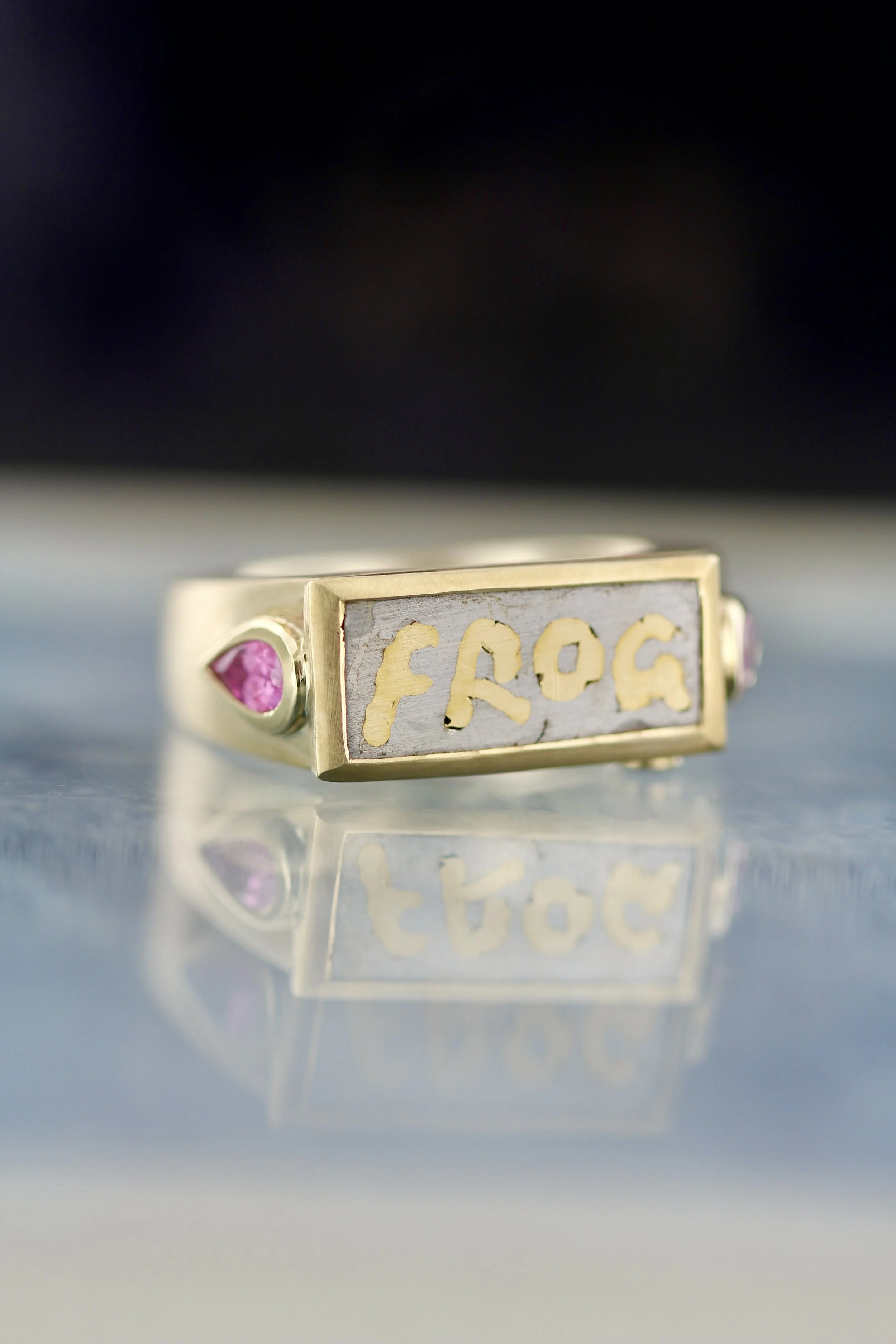 Meteorite slice with 18k yellow gold ‘FROG’ inlay. Handmade ring in 9k yellow gold, with bezel set pink sapphires and demantoid garnet.