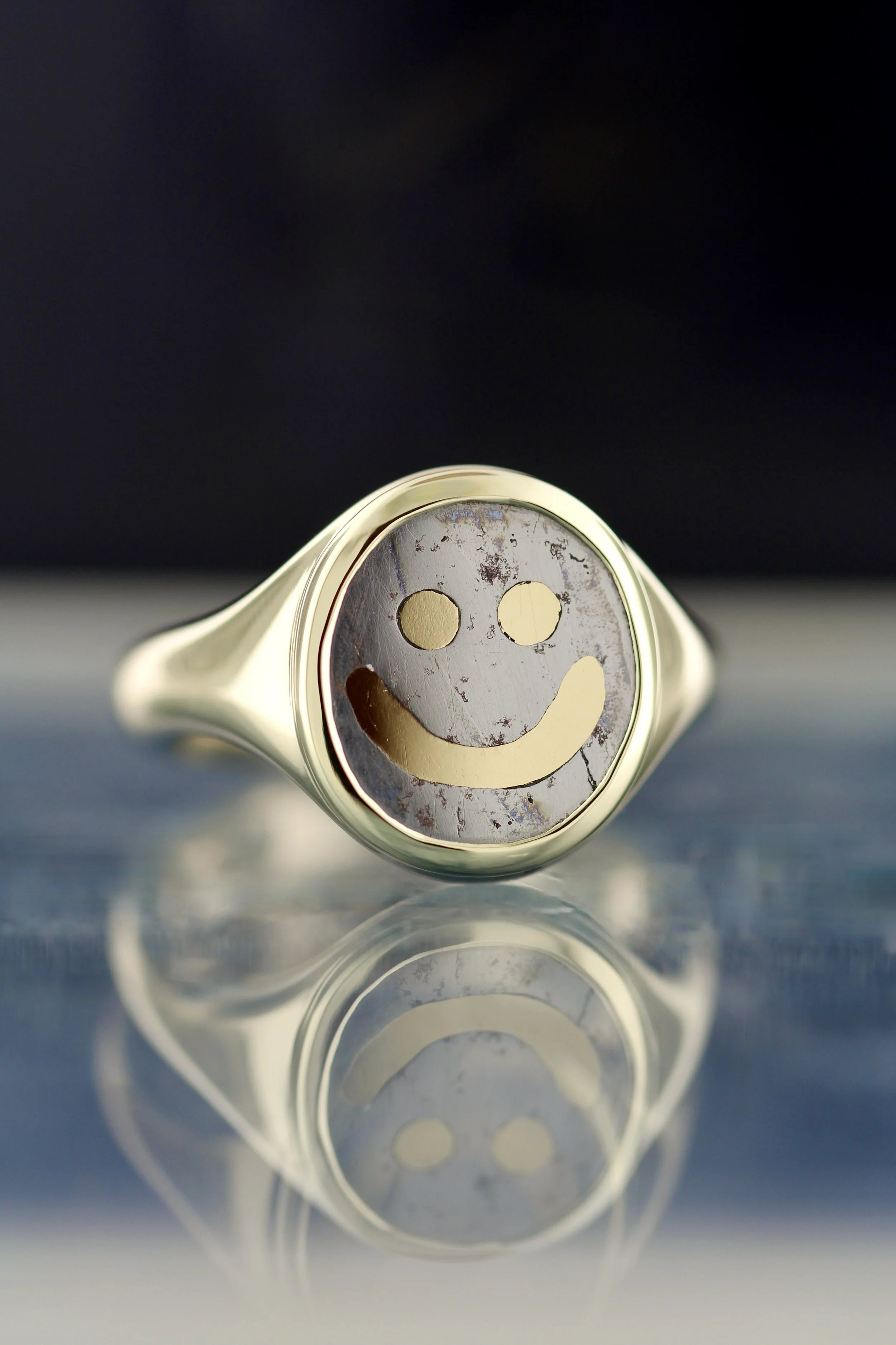 Meteorite slice with 18k yellow gold Smiley inlay, set in 9k yellow gold.
