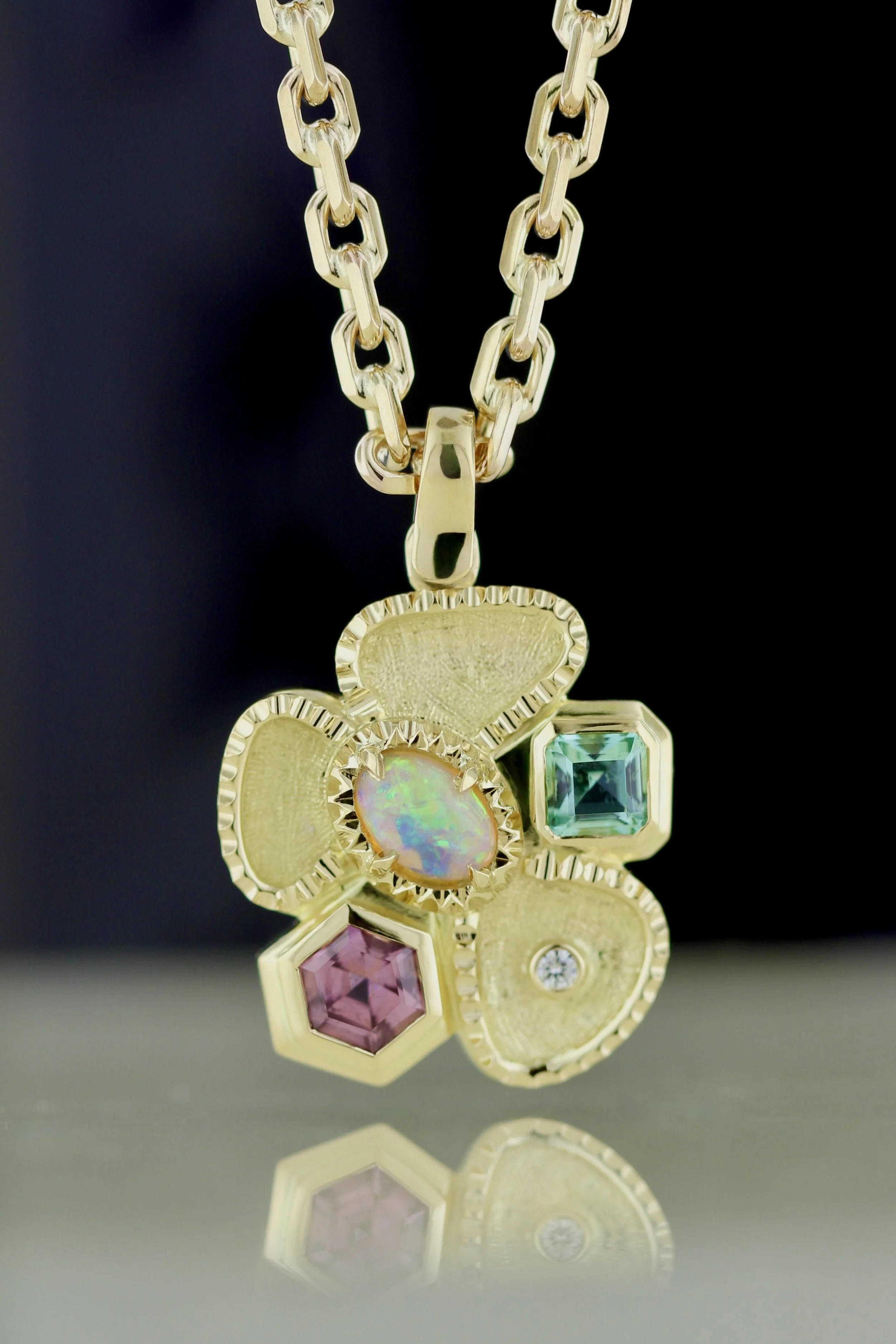 18K yellow gold pendant with claw set solid crystal opal from Lightning Ridge, bezel set Australian emerald, hexagon pink sapphire and bezel set natural white diamond.