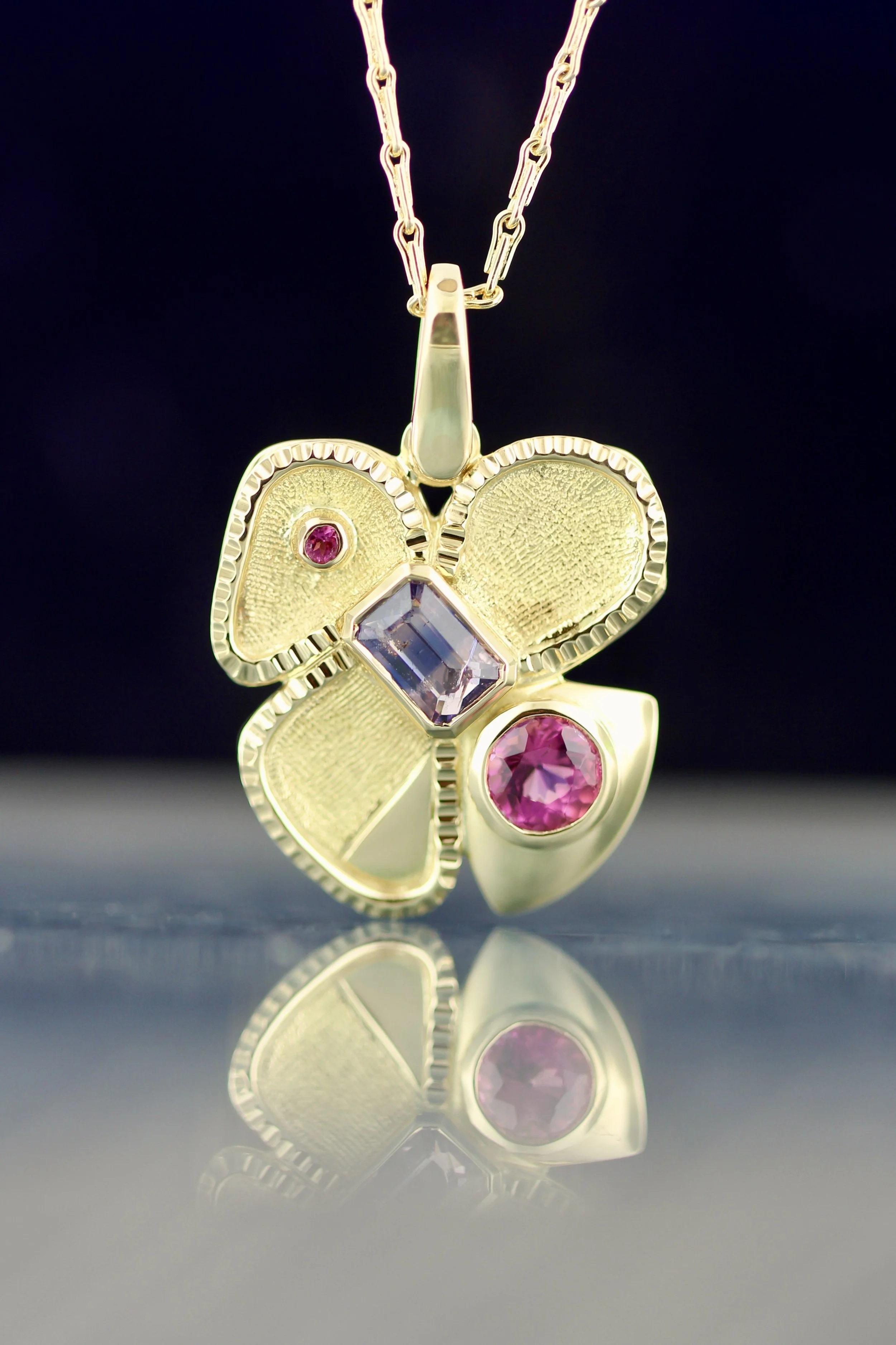 18K yellow gold handmade pendant with bezel set Winza sapphire, pink tourmaline and pink sapphire.