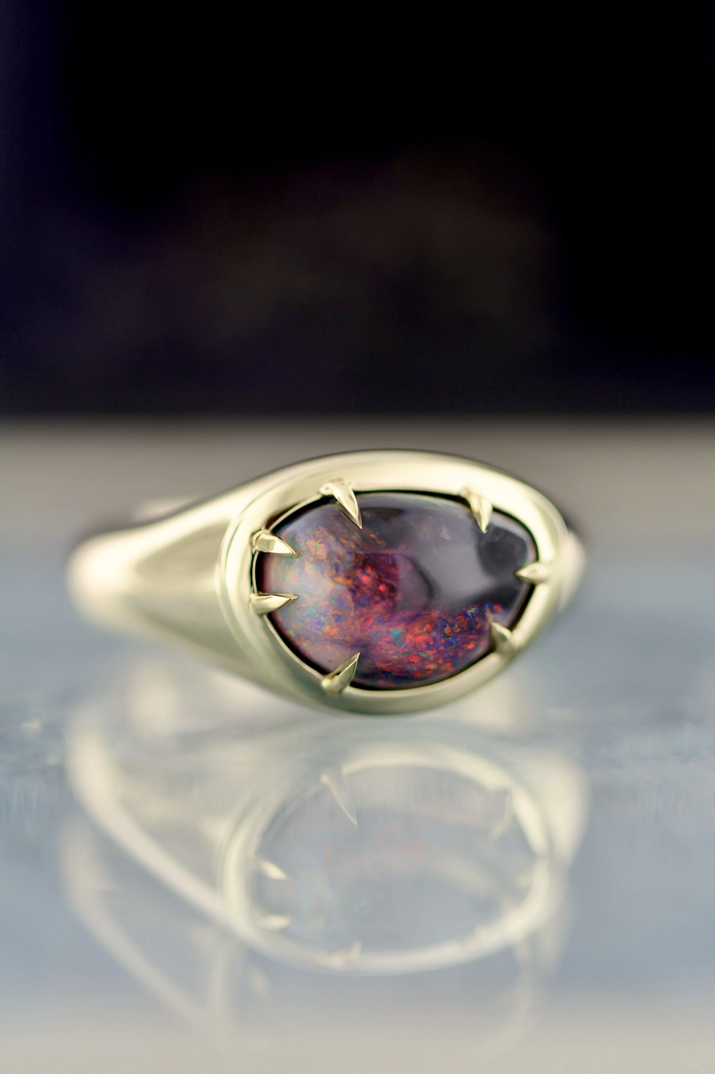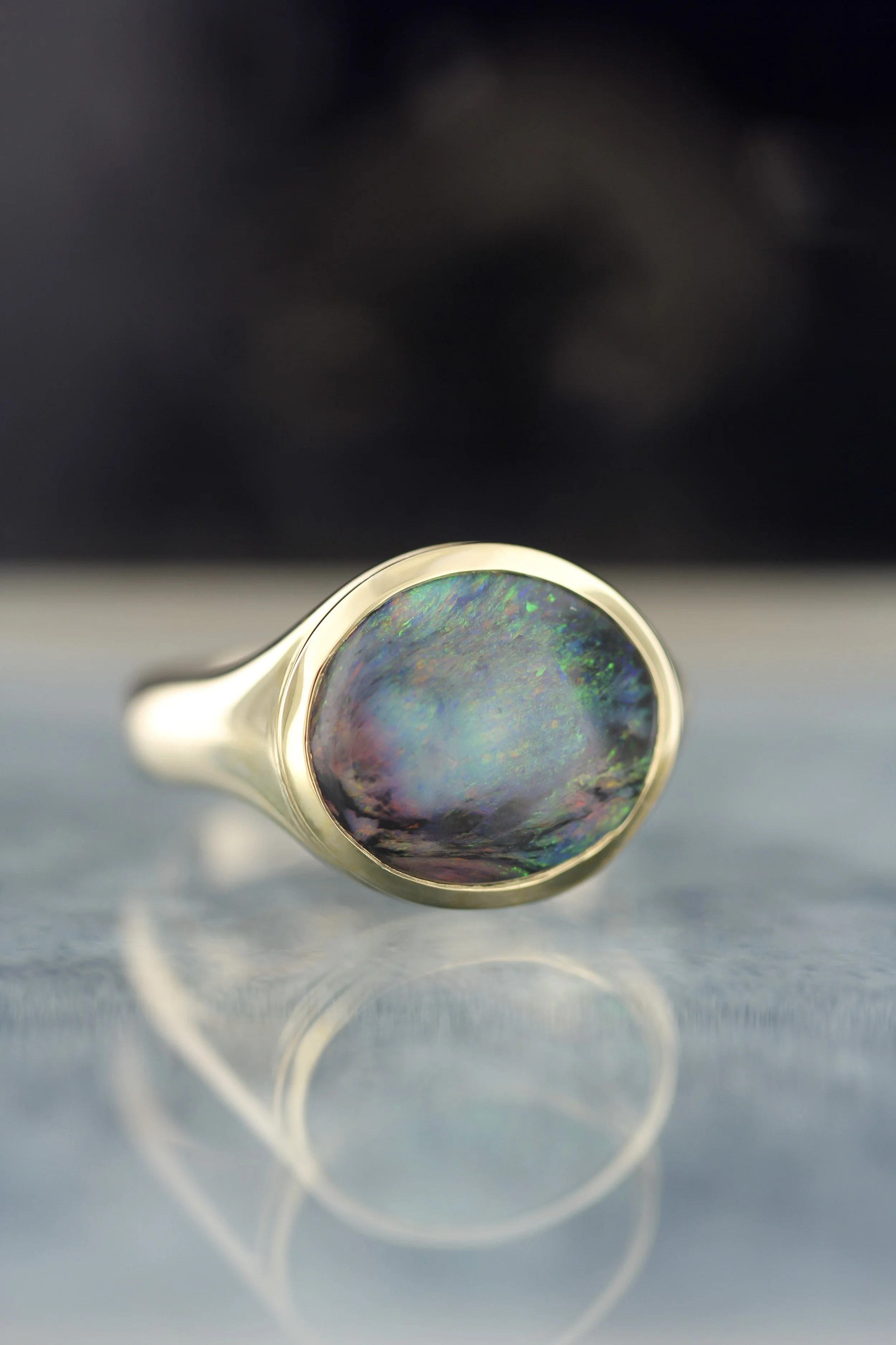 9K and 18k yellow gold bezel set solid black opal from Lightning Ridge.