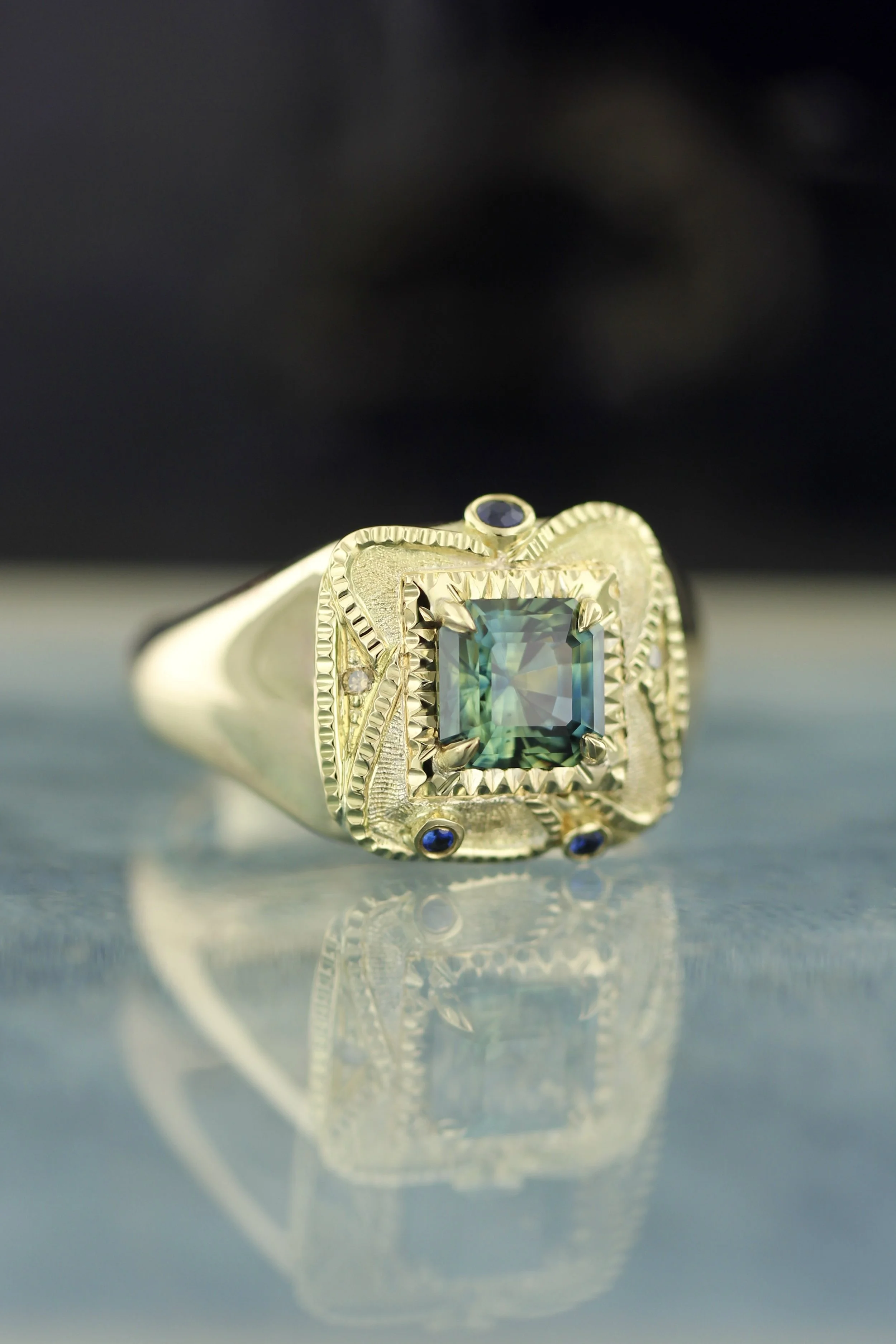9K and 18k yellow gold ring with claw set square radiant cut Australian sapphire, bezel set blue Australian Sapphires and bead set natural cognac diamonds