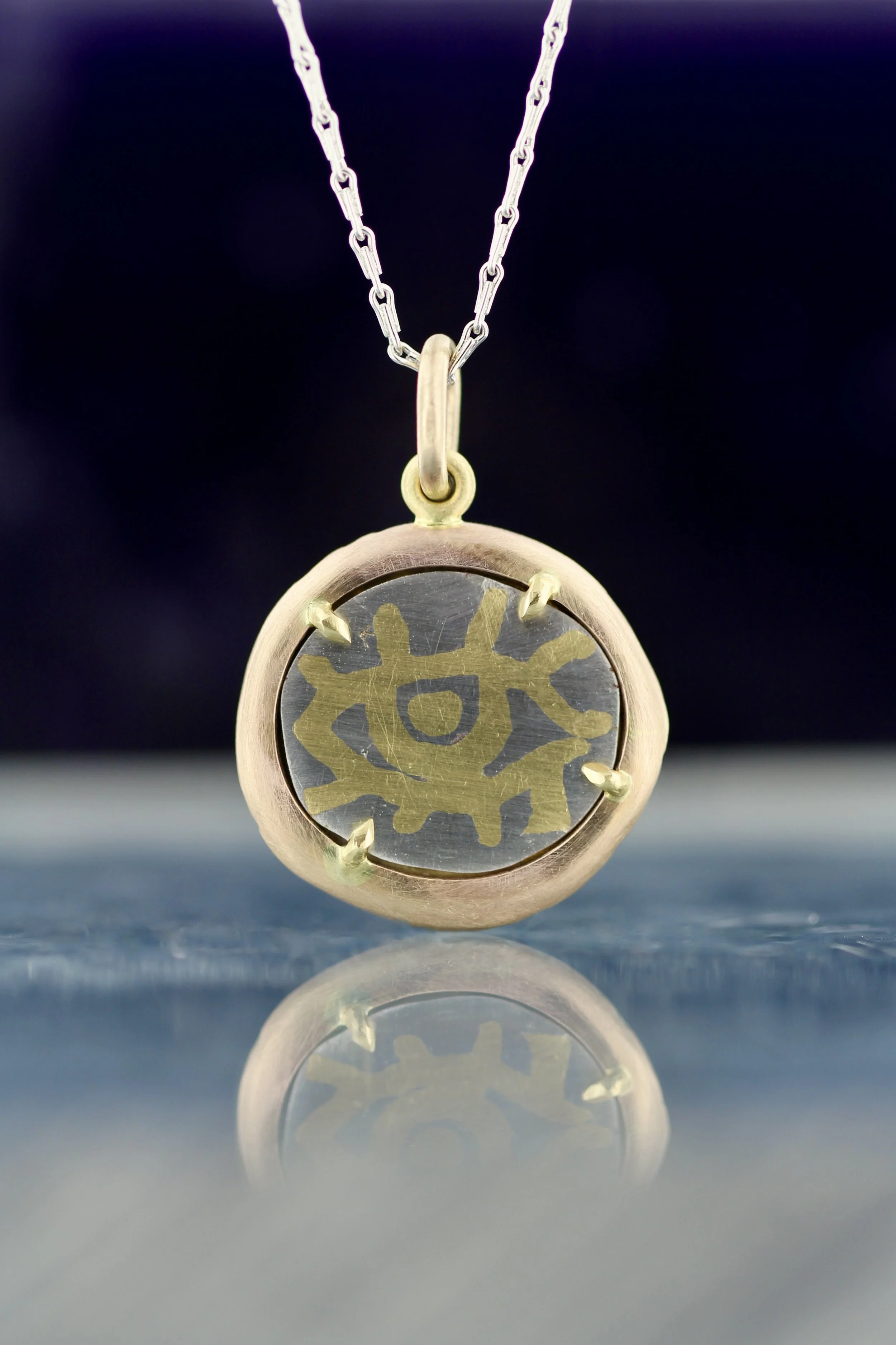 Meteorite slice with 18k yellow gold Eye inlay, set in 9k and 18k yellow gold pendant on 18k white gold chain.